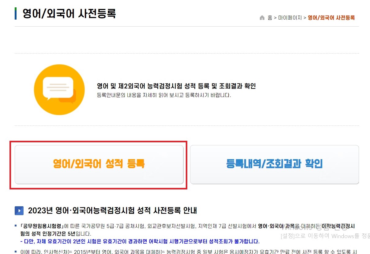 4. 영어/외국어 성적 등록을 클릭해 줍니다.